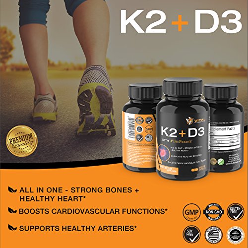 PREMIUM QUALITY: Vital K2 + D3 is Non-GMO, Gluten-Free, Soy-Free, Vegetarian, 100% all natural formula complex made from highest quality Made in USA ingredients designed to support healthy heart and strong bones