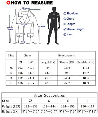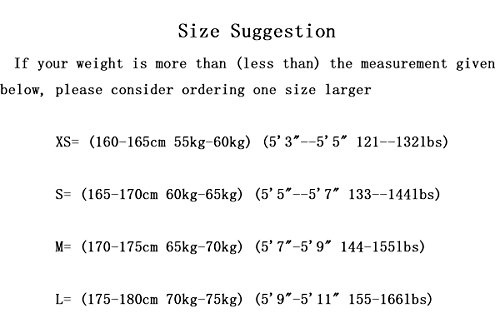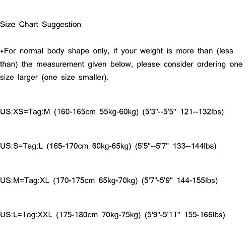 *To ensure your best fit, please have a careful check of size info before order; *Should any doubts, please contact Kabbeen customer service team directly for suggestions only, along with your detailed size info. Size Chart Suggestion *For normal body shape only, if your weight is more than (less than) the measurement given below, please consider ordering one size larger (one size smaller). US XS = ~5'5"~(165cm), ~135 lbs~(60kg) US S = ~5'7"~(170cm), ~150 lbs~(65kg) US M = ~5'9"~(175cm), ~160 lbs~(70kg) US L = ~5'11"~(180cm), ~170 lbs~(75kg) 0