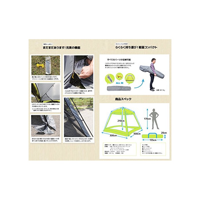 이 크기에서 중량 불과 약7.3kg와 운반도 간단.4 면풀 메쉬 풀 크로우즈 대응 2 면풀 오픈 틈에서 벌레가 들어 가기 어려운 연장 스커트 사양으로 쾌적하게 보낼 수 있습니다.