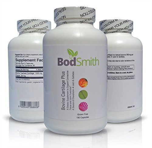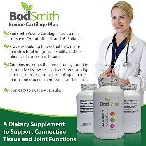 A dietary supplement to support connective tissue and joint functions.* BodSmith Bovine Cartilage Plus is a high potency, glycosaminoglycan preparation from bovine tracheal cartilage. It provides a rich natural source of biologically active Chondroitin -4- and -6- Sulfates.