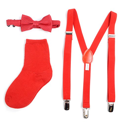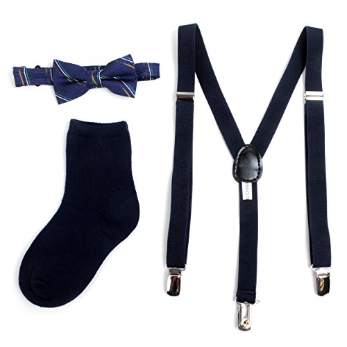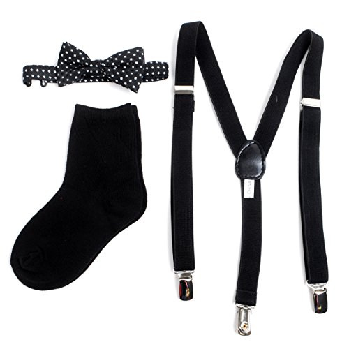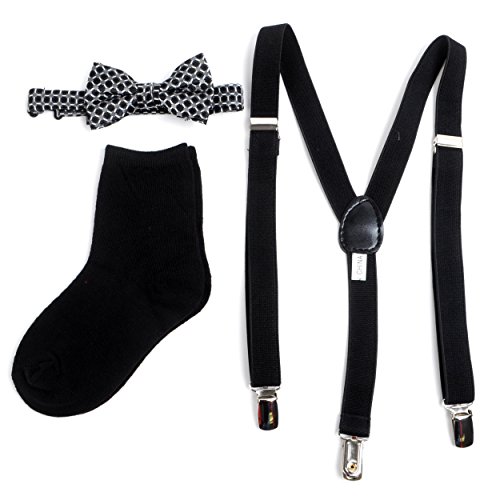 Product Description Dress him up like a young gentleman! Fashionable, elegant, and easy to wear! Our bow tie, suspender, sock set makes putting the finishing touches simple and confident! Whether its a formal gatherinng, pictures, holidays, weddings, there is no going wrong in creating a classic look. 0