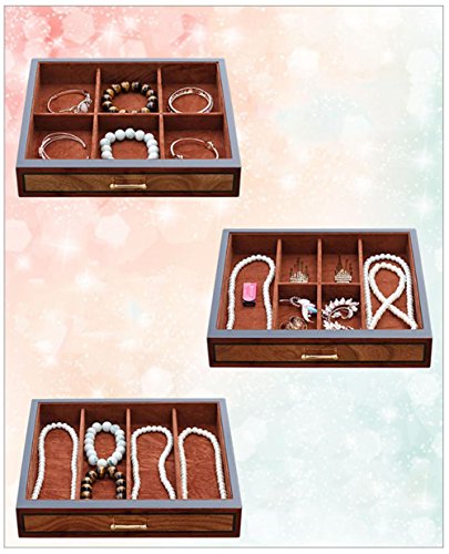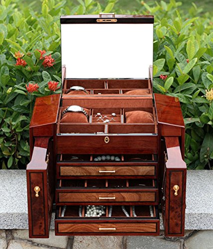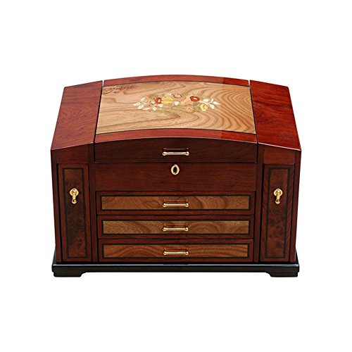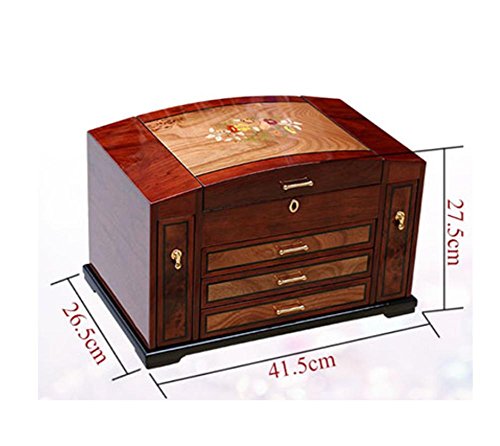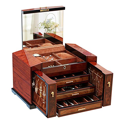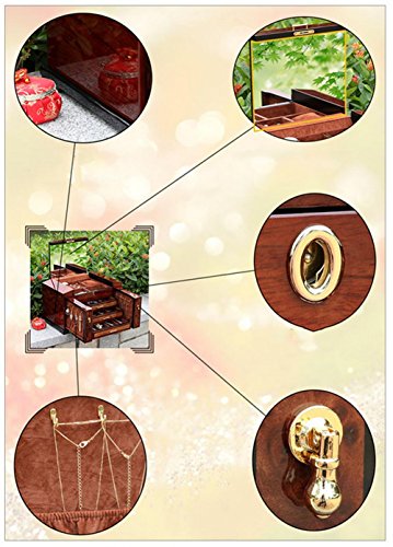 Product Details: The box of jewelry box curved shape, looks very upscale luxurious. Jewelry box with a lock, you can lock up the lid, better protect your valuable items are not lost. The jewel case is covered with a large mirror and can be used for dressing. The mirror in front of five lattice, the back of the left and right two lattice with pillow sets, can put expensive watches, the middle is the ring groove, the front column of two, you can put valuables. The jewelry box is also equipped with three drawers, on both sides there are two can be pulled out of the drawer, each drawer is equipped with 4 of metal hooks, can hang necklace or earrings, There's flannel bags underneath,can put the pendant part of the necklace into the velvet bag,? this is a very humane design. Product Features: The surface of the jewelry box is photocatalyst paint, completely harmless to the human body and the environment,the product of the painting equipment is the use of advanced automatic painting equipment, the uniformity of the product's paint is ensured and the effect of the mirror coating is completely achieved. The interior uses the high-grade wine red soft pattern velvet, can protect your jewelry effectively not to be scratched, does not change color, no Ken color. Locks, handles, hinges and other hardware are imported from Taiwan high quality hanging plating products, the use of 20 years without rust, not oxidation, not only has a practical and more valuable collection, is the intimate partner of every jewelry lovers.