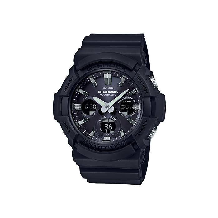 The set includes: body, box, instruction manual, warranty card is enhanced waterproof accessories for daily life in the instruction manual: 20BAR impact structure world six stations (day × 2, North America, UK, Germany, middle) corresponding Solar radio needle retraction function from evolving G-SHOCK pursue toughness, GAW-100 of New models equipped with solar radio adopted a big case appeared. The clunky large case, a combination of the bezel made of metal, was to hone basic, and finished with a toughness design that combines the casual and quality of. Black in color, which was based on, adopted three different types of the bezel. The GAW-100B, we finished in cool design with a black aluminum bezel. Also subjected to vapor deposition coating to three-dimensional index according to its own resin molding, we expressed a sense of quality even in cool by a combination of a metal bezel. The pursuit of quality of standard design, is the emergence of New models equipped with Solar radio boasts a highly practical. / Module No: 5444 / ■ Shock structure / ■ Tough Solar (solar charge system) / ■ 20 atmospheric pressure waterproof function / ■ Radio reception function: Automatic reception (up to 6 times / day) (China radio waves up to 5 times / day) / manual reception, reception radio wave: JJY, frequency: 40kHz / 60kHz (Fukushima / both bureau in Kyushu model) reception electric wave: WWVB, frequency: 60kHz reception electric wave: MSF / DCF77, frequency : 60kHz / 77.5kHz received radio wave: BPC, frequency: 68.5kHz * If you set the home time setting to the reception possible city, the receiving stations according to the city. In addition, time difference is set by the selected city. / ■ needle retraction function (when the needle is difficult to read overlap with the liquid crystal display can be temporarily saved the needle from the top of the liquid crystal display) / ■ World time: 48 cities (31 time zones, daylight saving time setting function per) + UTC (time display, home time of the city features replacement / ■ stopwatch (in hundredths of a second of Universal time Coordinated), 60-minute, split) / ■ timer (set unit: 1 second, set up: 100 minutes, 1 second measured in units) / ■ This five alarm (countdown function) times / ■ battery indicator displays / ■ power saving function (in the dark to save power and turn off the display after a certain time has elapsed) / ■ full auto calendar / ■ 12/24-hour display switching / ■ Beep ON / OFF switching function / ■ double LED light: the dial for LED light (full auto light, super illuminator, afterglow machine With afterglow time switch (1.5 seconds / 3 seconds)), LCD unit for LED backlights from (full automatic light, super Illuminator, afterglow function, switching afterglow time (1.5 seconds / 3 seconds) with) / ■ when fully charged in the case of drive time function use of solar power in the state without: for about seven months the power saving state: about 18 months / resist shock / LED: White / around the arm (maximum) about 21.5cm