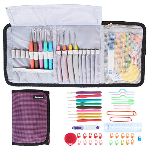 Damero Ergonomic Crochet Hooks Set, Crochet Accessories Kit/ Roll Up Storage Bag with Soft Grip Crochet Needles and Knitting Accessories, Purple
