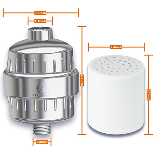 - ★VERSATILE HIGH-PERFORMANCE DESIGN: This shower filter purifier is Made from galvanized food grade ABS material featuring dimensions 3.3 x4.7” and Inner core size: 2.4x2.7” for use with water flow 8~10L / Min at 0℃~ 80℃/32℉~176℉ suitable for showerheads, handheld hoses, rain, and combo showers. To ensure optimal performance replace each cartridge after 6months/ 12,000 gallons of water.