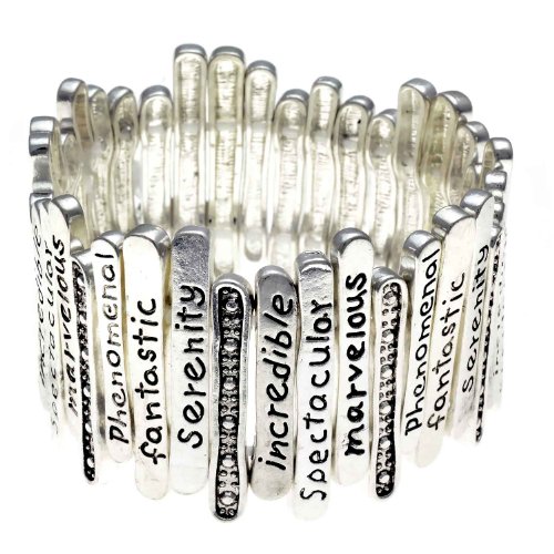 -. Binding : Jewelry -. Brand : PammyJ -. Department : womens -. EAN : 6639562950962 -. Feature : Bracelet has inspirational words inscribed all around such as phenomenal, marvelous, serenity / Bracelet is 1 1/2 inches wide / Stretch bracelet fits up to a size 7 wrist / Comes in a gift box / Imported -. Model : 6213 -. MPN : 6213 -. PartNumber : 6213 -. ProductGroup : Jewelry -. ProductTypeName : FASHIONNECKLACEBRACELETANKLET -. Title : PammyJ Silvertone Metal Casting Inspirational Stretch Bracelet -- Marvelous Incredible Spectacular