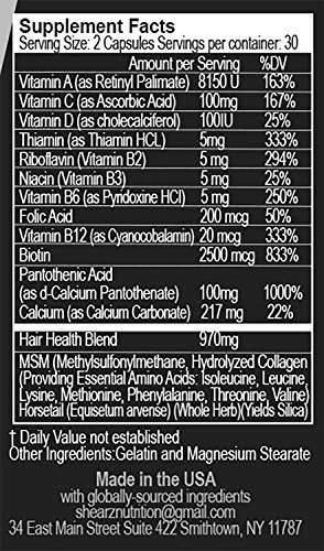 Shearz Nutrition Clinical Hair Health vitamins are formulated to fill in the gaps left by your regular diet and provide your body with the nutrition it needs to grow healthy hair from the INSIDE OUT.* Our clinical Hair Health Blend provides the hair with strengthening amino acids in Hydrolyzed Collagen, MSM for vitality, and hair boosting Horsetail and Silica.* Other Key Ingredients: Vitamins A and D provide antioxidant protection that helps promote healthy hair and scalp.* Niacin helps promote blood circulation to the scalp.* Pantothenic Acid strengthens and nourishes the hair follicle.* Vitamin B12 helps promote the transportation of oxygen to the scalp and follicles.* Biotin promotes the growth of existing hair, produces keratin, and works to increase hair's elasticity.* Additional ingredients include: Vitamin B1, B2, B6, C, Folic Acid, and Calcium. *DISCLAIMER: The statements have not been evaluated by the Food and Drug Administration. The products and information mentioned on this site are not intended to diagnose, treat, cure, or prevent any disease. Individual results may vary.Feature