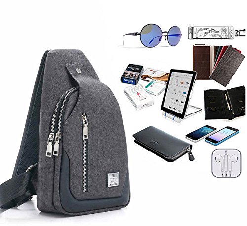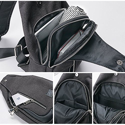 ✔Multiple Storage Purpose Chest Bag: 1 front pocket with a magnetic button and 2 large zippered compartments with small inner pouches to safely store and organize your kindle, IPAD mini, camera, umbrella, passport, purse, keys, small snacks,MP3, power bank, notebook, water bottle, or so on. 2 small zippered pockets (1 front one and 1 back one) can hold things such as phone, business cards, cash and change...