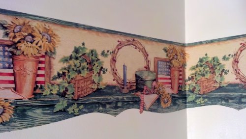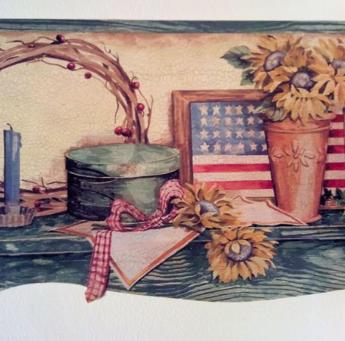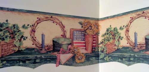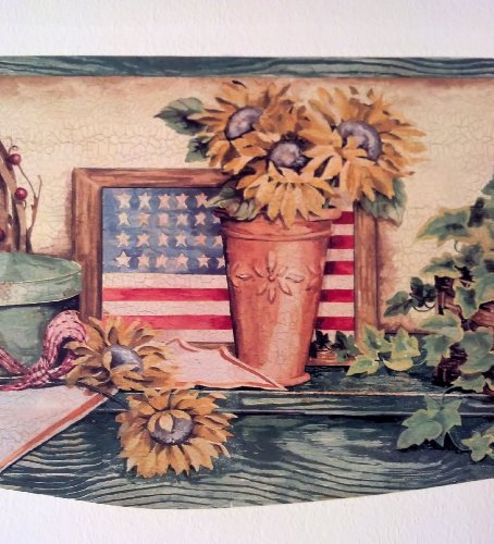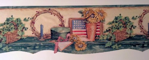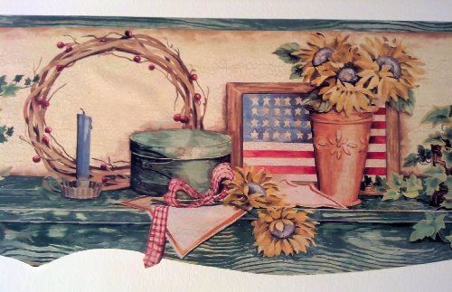 -. Title : Wallpaper Border Country Berry Wreath Sunflowers Ivy American Flag on Green Shelf