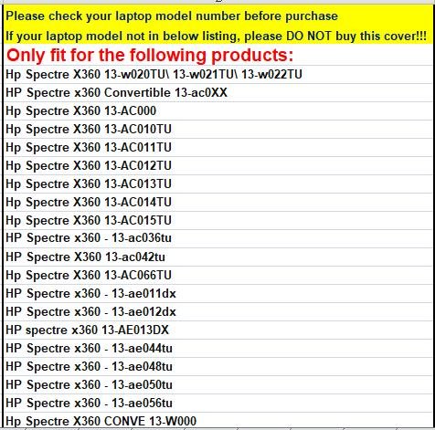 - Only fit for the following products: Hp Spectre X360 13-w020TU、 13-w021TU、 13-w022TU、Hp Spectre X360 13-AC010TU 、13-AC011TU 、13-AC012TU 、13-AC013TU 、13-AC014TU 、13-AC015TU、13-AC066TU、13-AC000, 13-AE013DX, 13-ac042tu, 13-ae044tu, 13-ae048tu, 13-ae050tu, 13-ae056tu. CAN NOT fit for other Hp Spectre computers