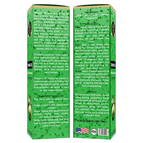 REWIND WITH NATURE Virgin Organic Tamanu Oil. Our organic tamanu oil is obtained by cold pressing natural nut kernel of the Calophyllum tree indigenous to Madagascar and Southeast Asia. The oil is then filtered, leaving a viscous green liquid. Tamanu oil is suitable for general skin and cosmetic purposes. It can be used directly on the skin or mixed within formulations or as massage formulations . The oil is absorbed leaving skin feeling smooth, plump and soft without a greasy residue. Tamanu oil contains moisturizing omega fatty acids which is well known to promote new, healthy cell growth. It has antimicrobial properties antioxidant properties and helps to prevent sun damage and wrinkles, anti aging , eczema . Tamanu oil comes from the inside kernel of the fruit bloomed by the tamanu tree, which leads to a pungent, nutty scent and a dark green color. Our Tamanu Oil will definitely rejuvenate your skin for you.Feature