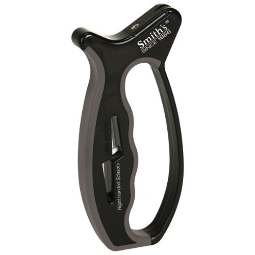 Features specially designed V shaped cutting Slot with Tungsten carbide inserts which allows for fast and easy sharpening. Black finger groove plastic handle with rubberized grip features floating ceramic sharpening rod for left or right handed scissors. Knuckle guard. Hang packaged.; country of origin: China; brand name: Smith's Sharpeners; Category name: saleFeature