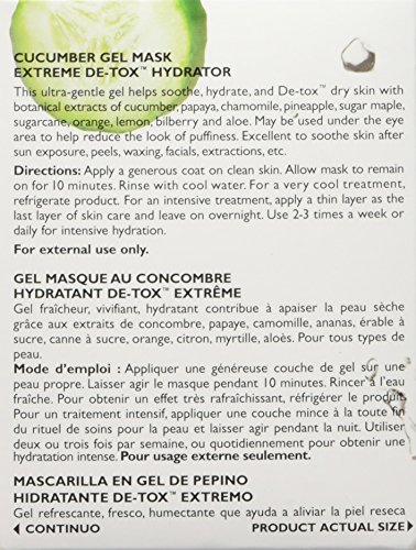 -. Feature : 150 ML / 5 FL OZ / Refreshing, cooling, moisturizing and calming gel helps soothe dry, irritated skin. With extracts of cucumber, papaya, chamomile, pineapple, sugar maple, sugarcane, orange, lemon, bilberry, aloe. For all skin types. / This ultra-gentle gel helps soothe, hydrate, and detoxify dry, irritated skin with botanical extracts of cucumber, papaya, chamomile, pineapple, sugar maple, sugarcane, orange, lemon, bilberry and aloe. May be used under the eye area to help reduce the look of puffiness. Excellent to calm and soothe irritated skin after sun exposure, peels, waxing, facials, extractions, etc. / Apply a generous coat on clean skin. Allow mask to remain on for 10 minutes. Rinse with cool water. For a very cool treatment, refrigerate product. For an intensive treatment, apply a thin layer as the last layer of skin care and leave on overnight. Use 2-3 times a week or daily for intensive hydration.