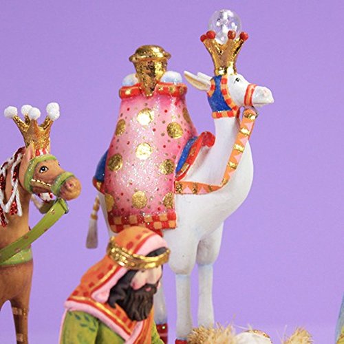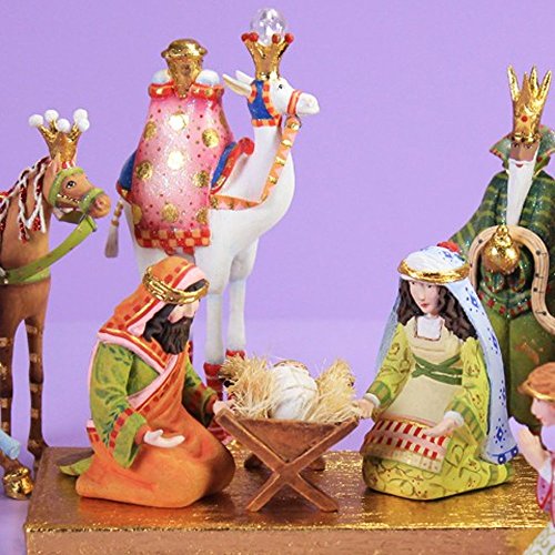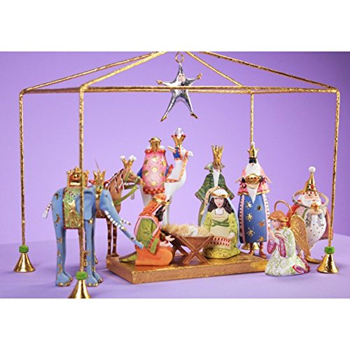 This mini scale version fits anywhere and includes the Holy Family, 3 Kings, one Camel, Horse, Elephant, and Kneeling Angel, the Star and a gold leaf stand and shelter.