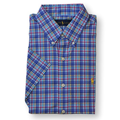 Ralph Lauren Men Short Sleeve Checkered Button-Down Poplin Shirt (M, Blue/Pink Plaid)