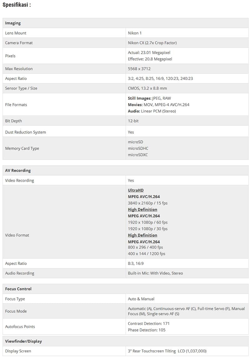 Nikon J5: 20.8 MP, 20 foto per detik dan bisa merekam video HD, layar LCD resolusi tinggi (1 juta titik) dan bisa diputar keatas. Nikon 1 10-30mm f/3.5-5.6 VR: Lensa zoom standar, lebih besar dari lensa yang diatas, cuma ada stabilizernya. (ekuivalen 27-81mm)