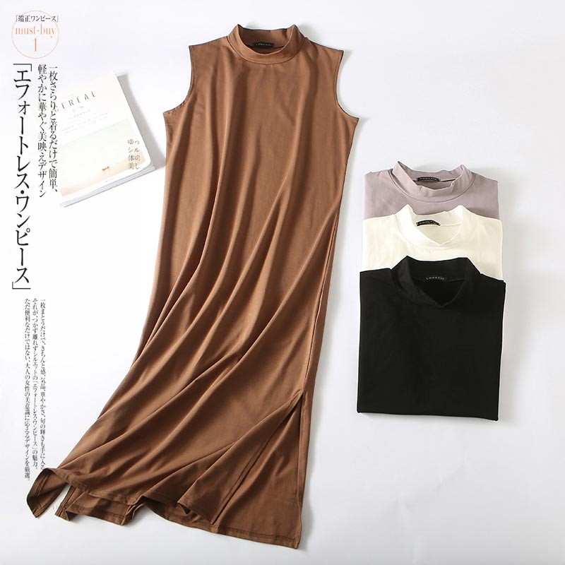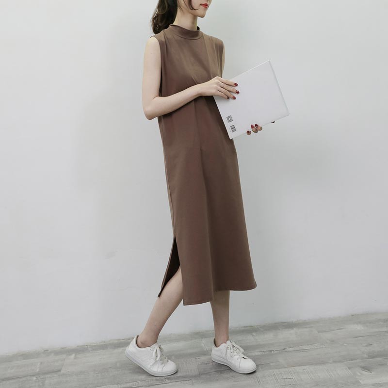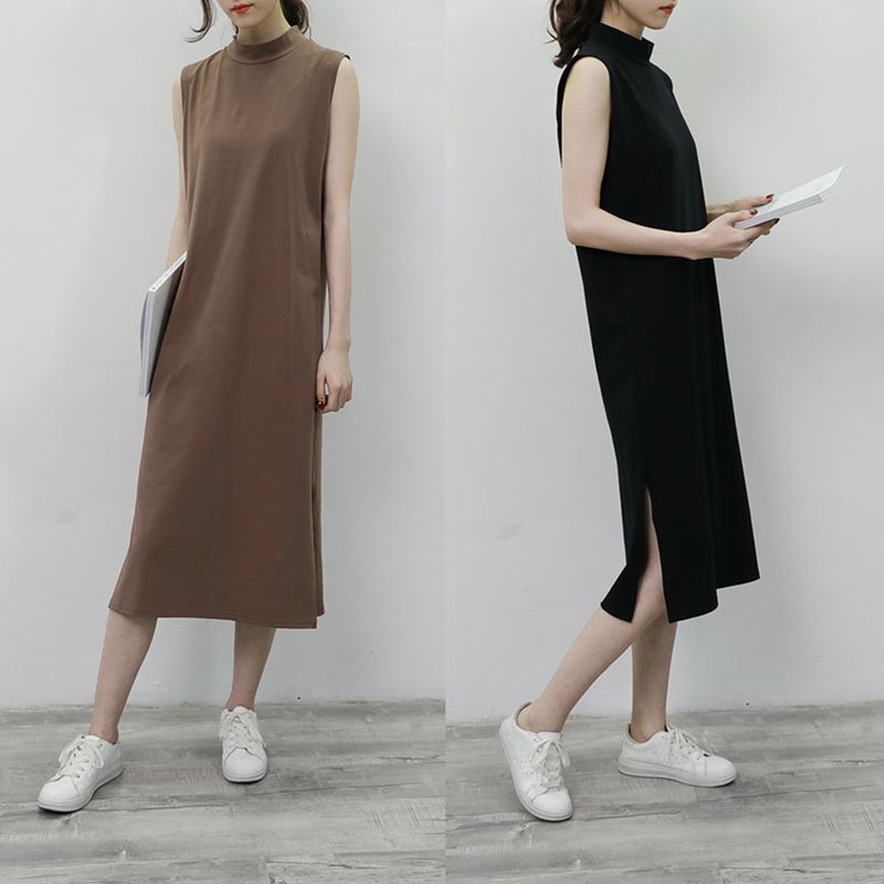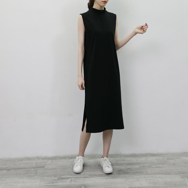 コットンのスタンドカラー・サイドスリット・ロング丈のノースリーブワンピ♪