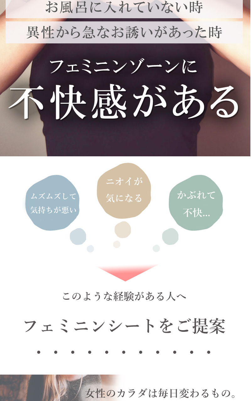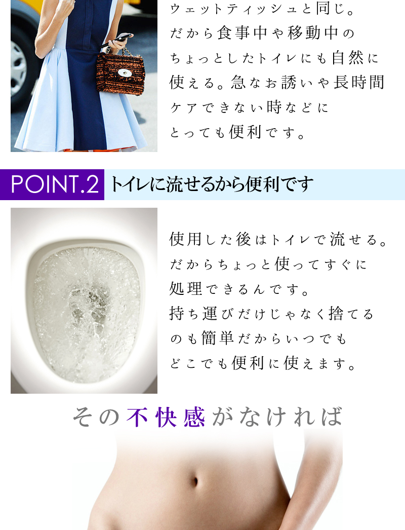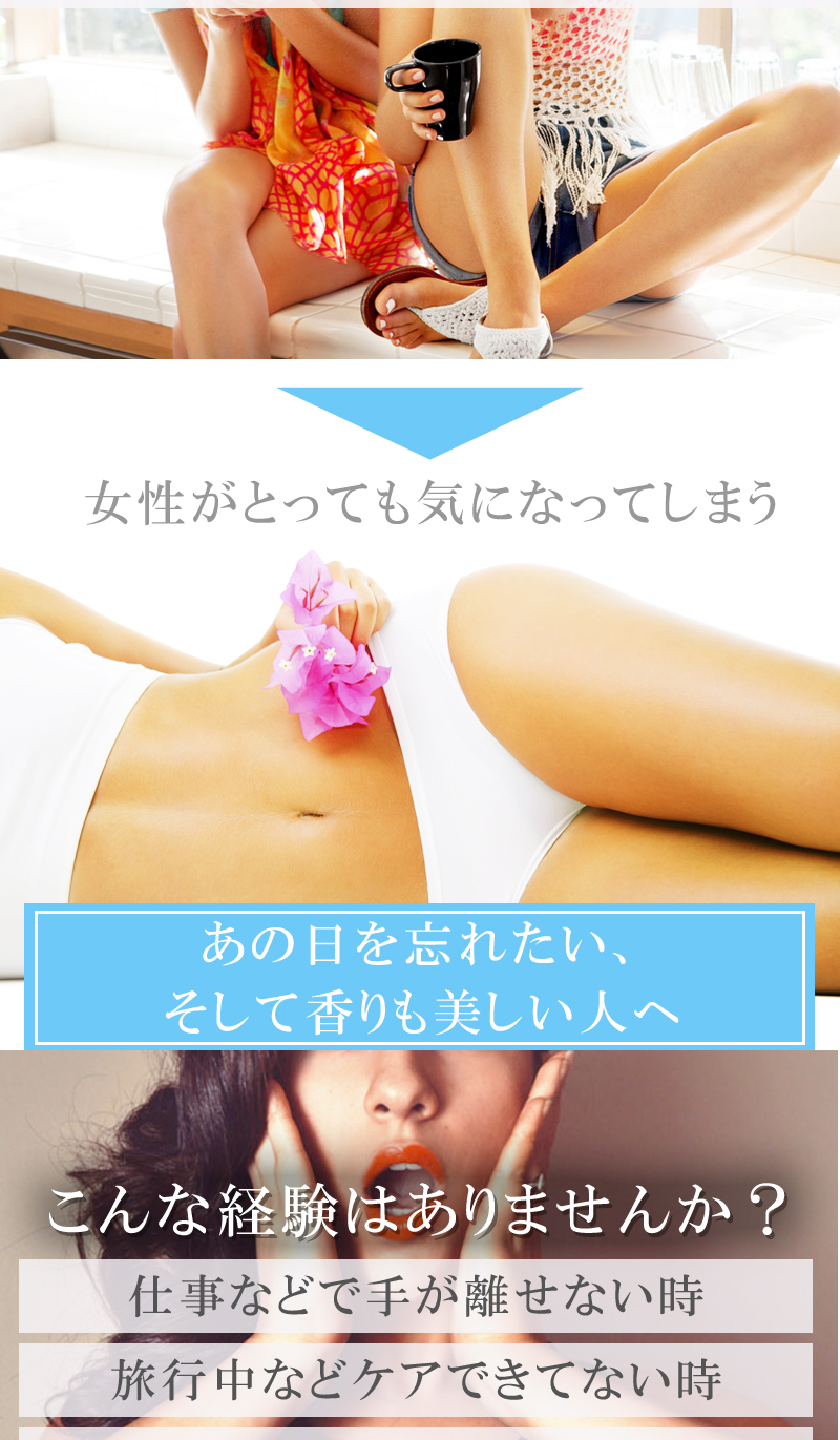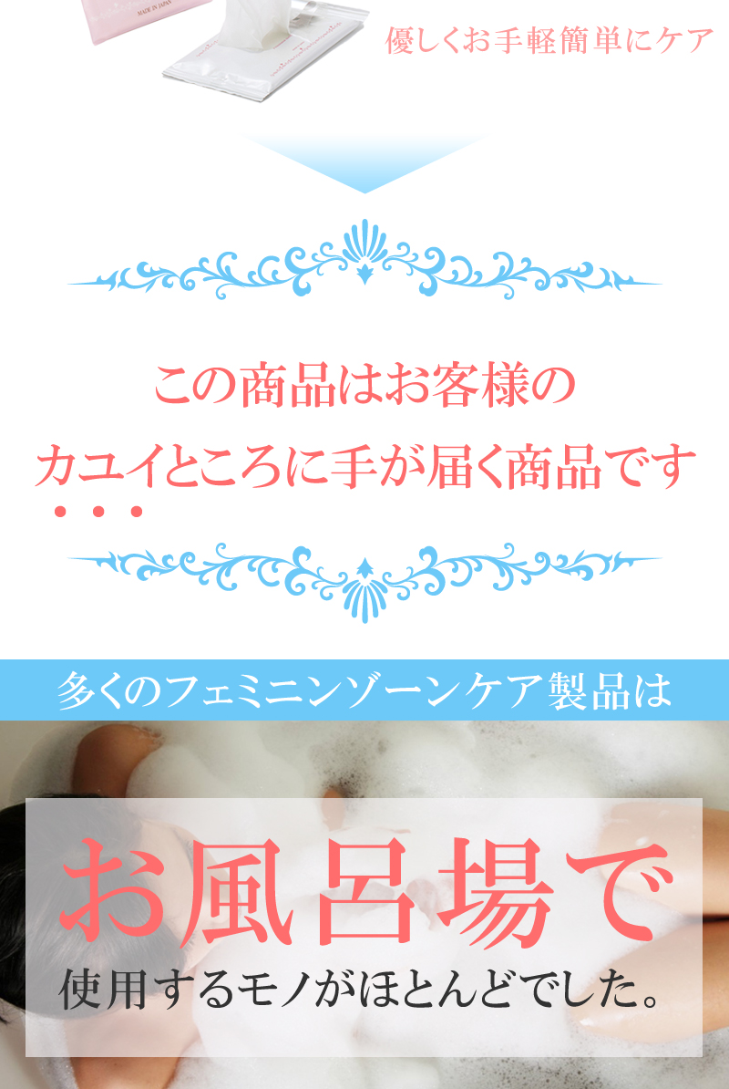 デリケートな部分などニオイの気になる箇所にご使用下さい。※シートの乾燥を防ぐため、使用後はシールをしっかり閉めて下さい。開封後は早めにお使い下さい。※生理中・妊娠中・授乳中の方はご使用にならないでください。 |