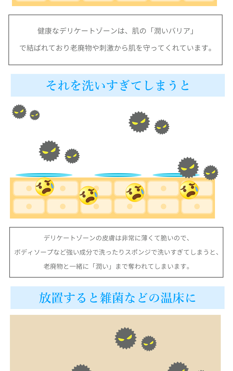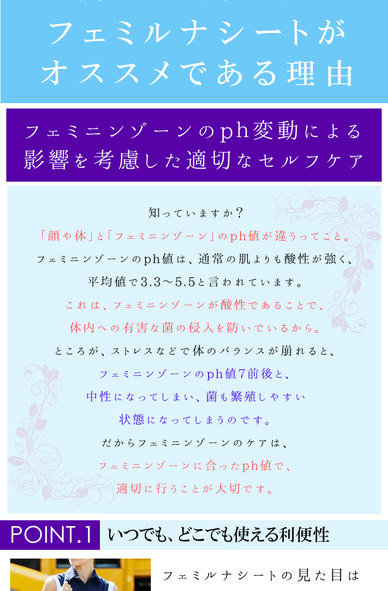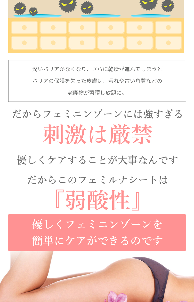 デリケートな部分などニオイの気になる箇所にご使用下さい。※シートの乾燥を防ぐため、使用後はシールをしっかり閉めて下さい。開封後は早めにお使い下さい。※生理中・妊娠中・授乳中の方はご使用にならないでください。 |