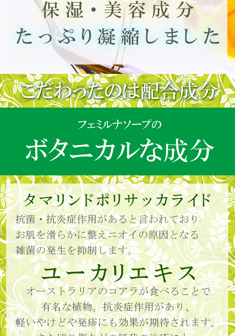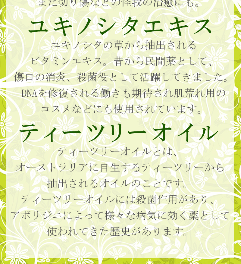 水、BG、グリセリン、ハマメリスエキス、チャ葉エキス、ウコン根茎エキス、マグワ根皮エキス、カンゾウ根エキス、ユキノシタエキス、タマリンド種子多糖体、ティーツリー葉油、ユーカリ葉油、o-シメン-5-オール、セチルピリジニウムクロリド、ポリアミノプロピルビグアニド、PEG-30水添ヒマシ油、フェノキシエタノール、リン酸2Na、クエン酸 |