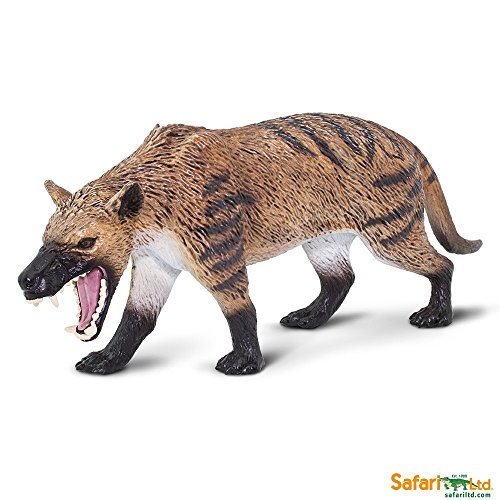 -. Feature : FEARSOME PREDATOR: The fearsome looking Hyaenodons were the top predators of their day, reigning for over 25 million years from the Eocene to the Miocene epochs. Hyaenodons looked like and behaved in a manner akin to modern day wolves. / EXPANSIVE TERRITORY: Hyaenodons were widespread at the time of their existence, with species found in Africa, Asia, North America and Europe. Hyaenodon gigas, one of the largest species, was found in Mongolia and lived during the Oligocene Epoch. Hyaenodon could grow to ten feet long and five feet at the shoulder, and could weigh over 1,000 lbs. / MADE WITH INDUSTRY-LEADING STANDARDS: Like all Safari Ltd products, this figurine has been individually hand painted, features quality construction from phthalate and lead-free materials, and includes an educational hangtag in 5 languages. / REALISTIC APPEARANCE FOR MULTIPLE USES: Realistic, educational, and fun, this figurine is suitable for a range of interests, including collectors, enthusiasts, teachers, and kids. Admire it on a shelf, use it in the classroom, or simply enjoy playing with it. / PRODUCT SPECIFICATIONS: This figure is 6 ¾ inches long and 3 inches tall, or a bit larger than a soda can on its side. Its coat is brown above, fading to white below, with black stripes on its back, tail and legs. Its muzzle and feet are also black, and the inside of its wide open mouth is pink.