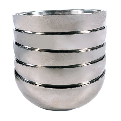 Made of type 201 stainless steel. The bowls are constructed by joining 2 thin layers together creating an airtight thermal insulated layer. The silver tone stainless steel set of 5 bowls each measures 4.6 inches in diameter.