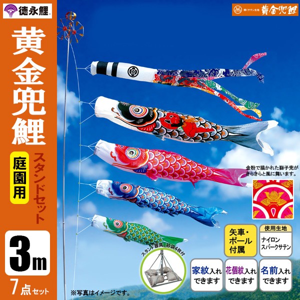 | 黄金兜鯉 庭園用大型鯉のぼり スタンド砂袋式ポール付セット | 1.5m鯉3匹 | 2m鯉3匹 | 3m鯉3匹 3m鯉4匹 3m鯉5匹 | 4m鯉3匹 4m鯉4匹 4m鯉5匹 |