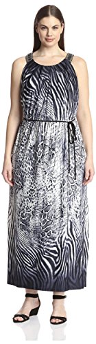 Product DescriptionSleeveless jersey knit dress with pleating at neckline, beading detail at shoulders, elastic waist with self-tie belt and high side slit0