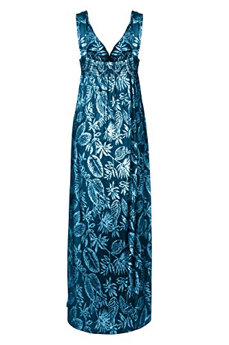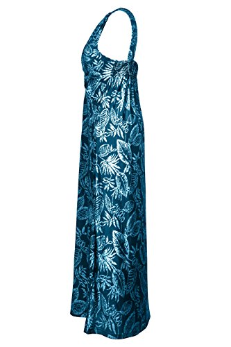 Sleeveless long smocked dress featuring a bohemian inspired bright bold printed pattern all throughout for the spring summer season. Surplice crossover v-neckline and a fitted smocked stretch construction accenuating the waistline. Ruched tie and smocked details at shoulders and a lengthy dress in a top quality medium weight jersey stretch knit for softness and comfort.Feature