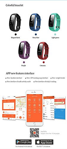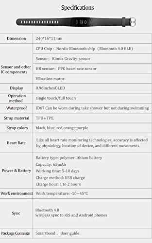-. Feature : ◆COLORFUL FUNCTION:Time line recording all day.Heart rate monitoring.Keep cardcopulmonary fitness level.Automatic sleep monitoring Call alerts and hang up.Support information notification.5displays availbale and one default standby display.Define clock diaplay.Colorful bracelet / ◆LONG-LASTING BATTERY :All-day activity Tracking record steps,distance,calorie and activity time.standby time is around 15days.Record heart rate in 24 hours continuously,help control your heart rate.Identify high accuracy to users with different skin colors. / ◆EASY TO OPERATE:Slide the screen to view the movement timeline on the bracelet,detailing your day's number of steps,distance,calories,heart rate,active time and other data. / ◆GPS INTEGRATION:When Connect mobile GPS,sporting rate and sporting distance can be seen in APP,you will always know where have you been and where you are. / ◆SPORT GUIDANCE:Do aerobic exercise regularly to enhance the endurance of heart and lung.Set heart rate zone well to do aerobic exercise then the effect will be better.Guide your breathing according to your heart rate setting zone.Thesmartband will vibrate to remind you of changing to gentle breathing when your heart rate data is too high.