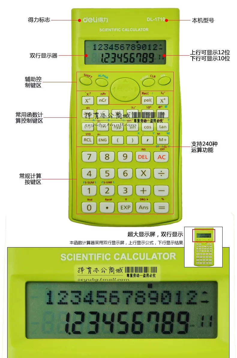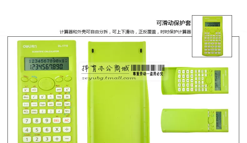 Product Name: Deli / Deli 1710A Brand: Deli / Deli Model: 1710A color classification: blue (comes standard electronic) light green (comes standard with electronic) purple (comes standard electronic) Type: Science function type screen material: LED screen・ the largest display digits: 10 + 2 adapter battery type: button battery
