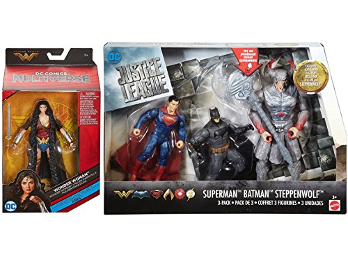 -. Binding : Toy -. Brand : AYB Products -. Color : Black -. EAN : 0728615896671 -. Feature : Justice League Movie Action Series Bundle 2-Pack / Wonder Woman 6" Multiverse Figure Ares Wave Fully posable figure with 20 points of articulation "God Killer" Sword / 6 inches (15.24cm) From the movie Wonder Woman Features movie accurate details and iconic accessories / DC Justice League Battle In a Box Batman, Steppenwolf, and Superman Figures 3pk / features an oversized Exclusive Steppenwolf, two key DC Super Hero figures and a light up weapon accessory! -. Genre : action -. Label : DC AYB -. Manufacturer : DC AYB -. MPN : JL-3pkHW -. PartNumber : JL-3pkHW -. ProductGroup : Toy -. ProductTypeName : TOYS_AND_GAMES -. Publisher : DC AYB -. Size : 6" -. Studio : DC AYB -. Title : DC Justice League Figures Movie 6" Multiverse Superman / Batman & Steppenwolf + Ares Wave - Wonder Woman with Sword 4-Pack -. UPC : 728615896671