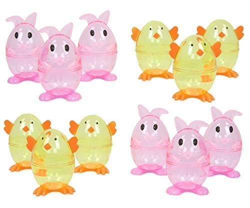Beautiful plastic large plastic eggs featuring pink bunny and yellow/orange chick. Sweet expressions on each, with chicks arms out and bunnies nose and whiskers in white. All 12 eggs are footed and can stand alone, and easily fillable. These make a great addition to your Easter collection.