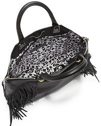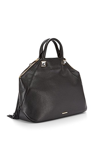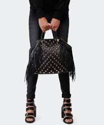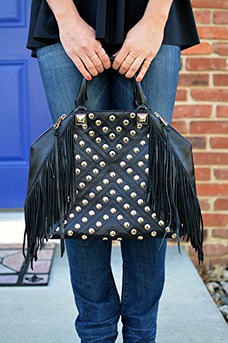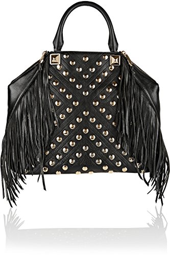 -. Brand : Rebecca Minkoff -. Color : Black -. Department : womens -. EAN : 0846632594353 -. PackageQuantity : 1 -. ProductGroup : Shoes -. ProductTypeName : HANDBAG -. Title : NWt! Rebecca Minkoff Rylan Tote with Fringe and Studs in Black -. UPC : 846632594353 Embellished with long fringe and goldtone hammered studs. Logo goldtone metal bar at back. Polished pale goldtone pyramid studs at front and back. 2 Logo zipper pulls. Polished goldtone hardware. Lined in leopard-print twill. Zip pocket and three slip pockets at interior. Rolled double leather handles. Magnetic snap closure. Side zip closures. 12.0" height x 15.0" width x 4.5" depth. 4.5" handle drop dust bag included. Imported Retail $895