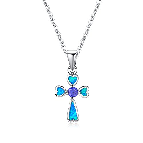 -. Title : Rhodium Plated Sterling Silver Synthetic Blue Opal Heart Cross Pendant Necklace
