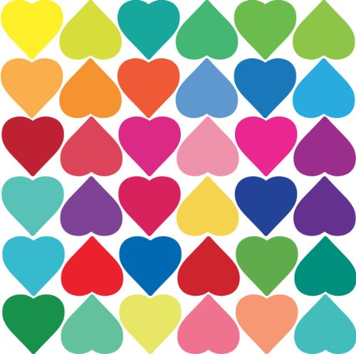 36 hearts! 36 bright multicolor hearts wall decals made of adhesive fabric. Repositionable peel and stick decal material Add a pop of color to your walls! Removable and reusable! No damage to your walls when you remove. Each heart is almost 4' inches in diameter, 36 all different FUN colors on a sheet! Make a border, a stripe of hearts, arrange as a headboard, make a design...these hearts can be arranged in countless ways