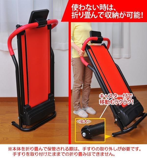 | 仕様 | 組立品 走行台角度:約5.7度 走行速度:1.0~6.0km/h 使用電源:AC100V(50/60Hz) 消費電力:300W 電源コード:1.9m 耐荷重:80kg 収納時サイズ:約幅55cm×奥行26cm×高さ113cm |