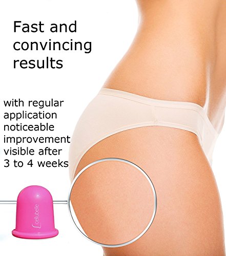 application: Always use Cellubelle in combination with a massage oil or an anti-cellulite creme. In addition, you should divide your affected body parts into zones (buttocks, legs, hips, thighs) and then process them one by one. For the vacuum massage simply press the Cellubelle together so that the air contained can escape. Then put the suction cup on the skin. This sucks your skin through the vacuum in the bell. The strength of this effect can be controlled and over time the strength should be increased slightly. Depending on the body part, work should then be carried out in circular or stroking movements. The tissue should be massaged 10-15 minutes from the inside to the outside, from top to bottom and in circular movements one after the other. This procedure should then be repeated regularly every 2 days. You can achieve maximum success in combination with a balanced, healthy diet as well as a regular sportive activity.
