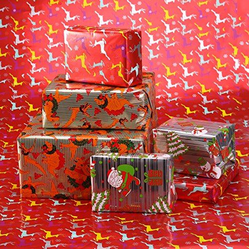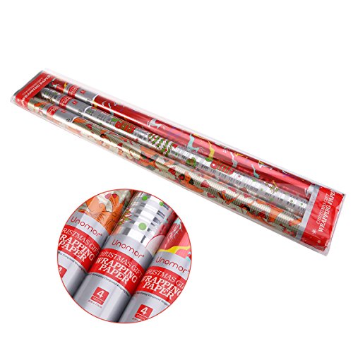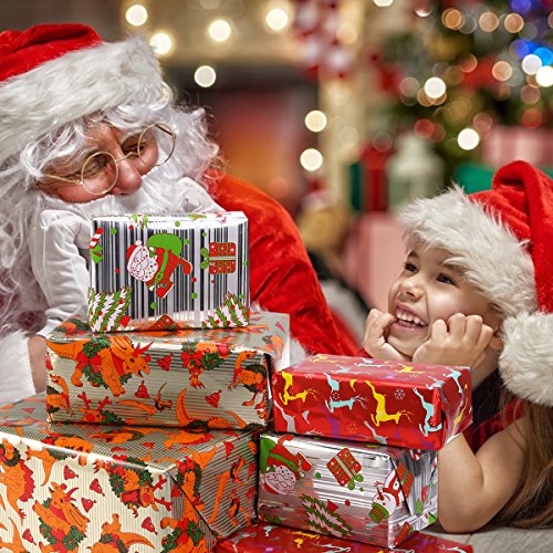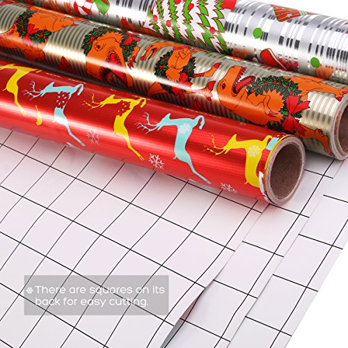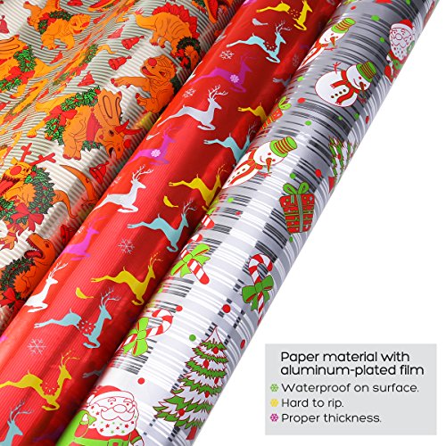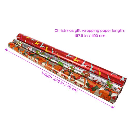 Why we are special?In this set you will get 3 rolls in 3 different designs. The red roll featuring reindeer, bird and snowflake. The golden roll featuring dinosaur wearing Christmas wreaths. The silver roll featuring Santa Clause, snowman and gifts. The smooth, shiny glossy finish makes the wrapping paper fashionable and shines the one who you sent the present. Cutting line on the reverse side is easier for you to cut the paper to your desired shape.