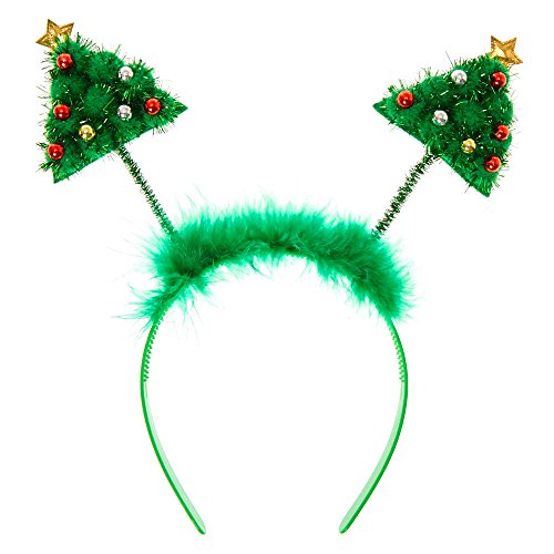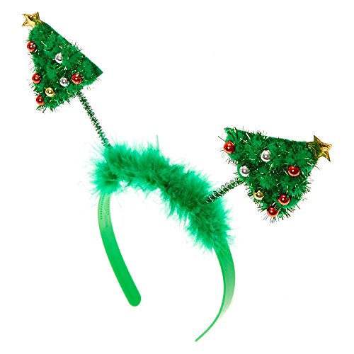 Studio : Claire's Publisher : Claire's Binding : Apparel Product Description Bop to the top in funky holiday fashion! This Christmas Tree Deely Booper Headband features two tinsel embellished trees with red, gold, and silver ornaments. The springs for the boppers are attached to a green band with matching feathers. Head bopper Christmas tree design Green plastic band 0