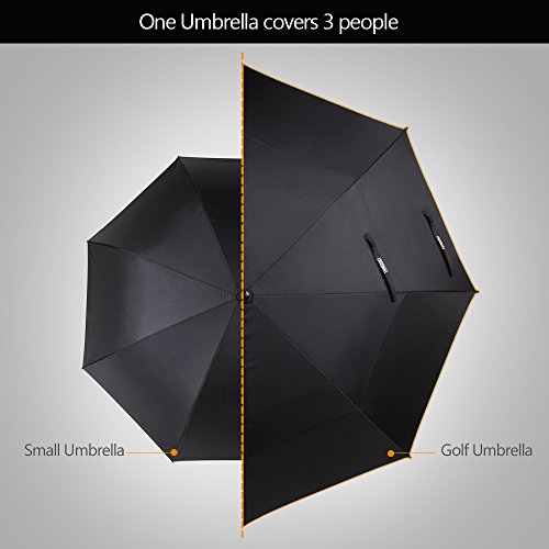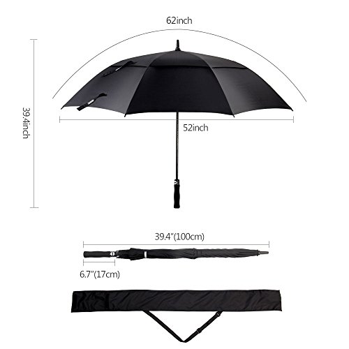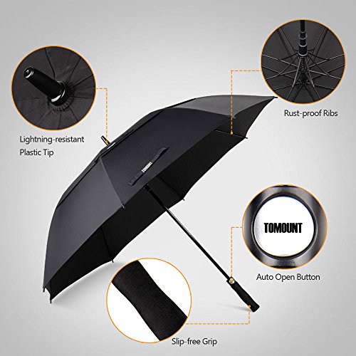 -. Feature : LARGE GOLF UMBRELLA: 62 inch extra large vented golf umbrella is big enough to cover 1-3 persons (arc 62'', diameter 52''), which is ideal for golfer and family outing. / STRONG AND WINDPROOF: Double canopy umbrella releases wind so you won't be blown away. 8 rust-proof fiberglass ribs build a strong frame to resist high wind. Non-slip EVA grip and compact cover make you easily handle and carry away the umbrella. / AUTO OPEN: Automatic open button allows you to quickly react to sudden downpour within one second. Plastic tip prevents attack from lightning and ensures your safety. / QUICK DRY: 210T high density pongee fabric resists rain with no leakage, which is much better than normal 190T umbrellas. The fabricis water repellent and quick to dry. It also shelters you from sunrays with UV protection function. You can use it in all kinds of weather condition. / GUARANTEE: 30-day money back for any reason and 1 year Tomount manufacturer replacement warranty for defects in premium materials and quality workmanship.