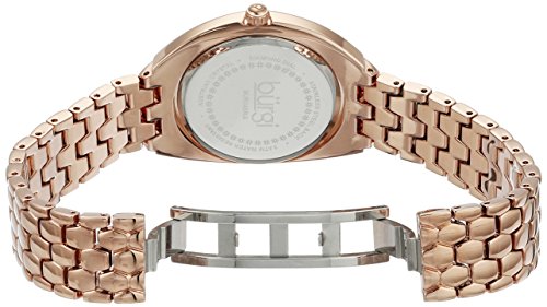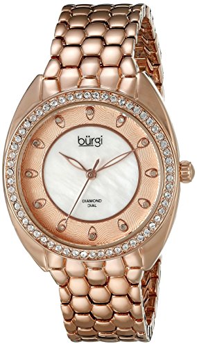 Studio : TWI Watches, LLC Publisher : TWI Watches, LLC Binding : Watch Product Description This women's timepiece by Burgi features a fascinating 33mm case with a rose gold tone finish. The outer dial has a rich stamped pattern and is home to hand-applied genuine diamond markers. The inner dial is made from a custom-cut piece of genuine mother-of-pearl. This watch is powered with a highly accurate Miyota quartz movement, which utilizes a classic three-hand indication, and the case is adorned with a fully integrated steel link bracelet with rose gold tone finish. 0