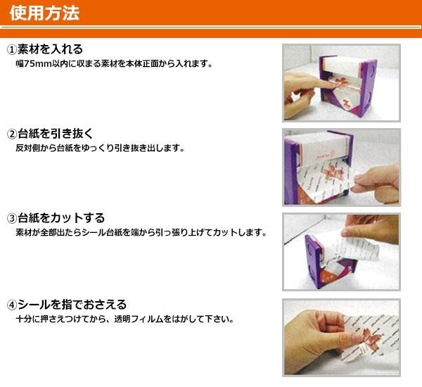 本体にシールにしたい素材を差し込み、台紙をひっぱってカットしてから透明フィルムをはがすだけで簡単にオリジナルシールが楽しめます。