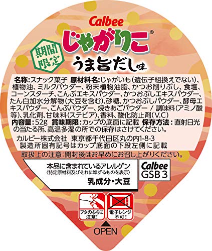原材料:じゃがいも(遺伝子組換えでない)、植物油、ミルクパウダー、粉末植物油脂、かつお削りぶし、食塩、コーンスターチ、こんぶエキスパウダー、かつおぶしエキスパウダー、たん白加水分解物(大豆を含む)、砂糖、かつおぶしパウダー、酵母エキスパウダー、こんぶパウダー、焼きあごパウダー/調味料(アミノ酸等)、乳化剤、甘味料(ステビア)、香料、酸化防止剤(V.C)