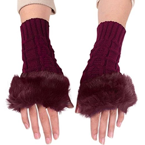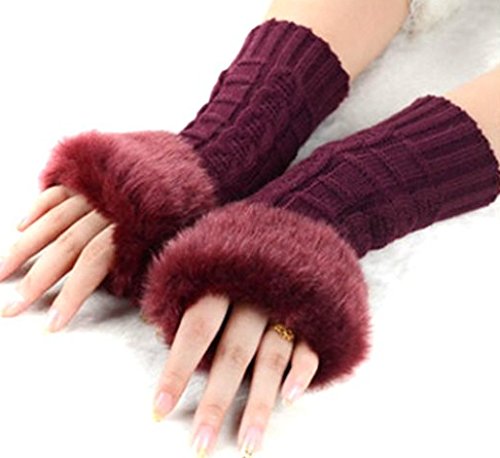 JOVANA New Women Ladies Winter Warm Knitted Faux Rabbit Fur Fingerless Gloves Mitten (Maroon)