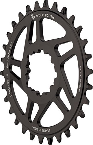 Studio : Wolf Tooth Components Publisher : Wolf Tooth Components Binding : Misc. Product Description Direct mount rings designed for SRAM cranks with removable spiders. This chainring is equipped with the patent pending Drop-Stop asymmetrical tooth design for the best in wear life, mud clearance, and chain retention. Not compatible with 9 speed chains. This chainring can also be used on long spindled BB30/PF30 cranksets. Compatible with S2200, S2210, X9,XO,XO1,XX1,X1 1400 cranks. Features Wolf Tooth's Drop-Stop tooth design for maximum chain retention. Made from 7075 Aluminum for long life. Optimized for use with 10, 11, and 12 speed chains. 52mm chainline. Material: Aluminum. Offset: 3. Defined Color: Black. Ring Position/TYPE: Chain Retaining Single Ring. Drivetrain Speeds: 10. Drivetrain Speeds: 11. Drivetrain Speeds: 12. Tooth Count: 30. Direct Mount Type: Direct Mount SRAM. Round or Oval: Round. Chainline/Hub Compatibility: 141/148 Boost Hubs. 0