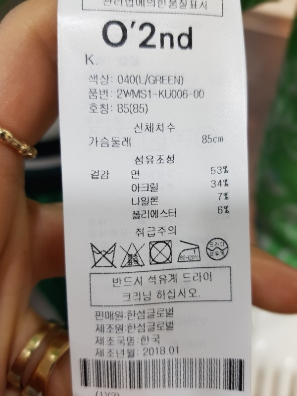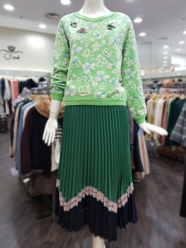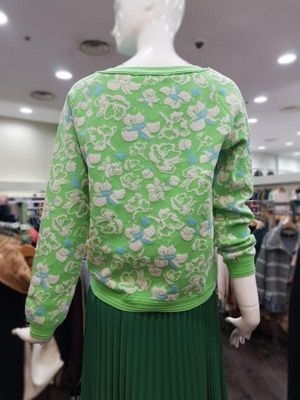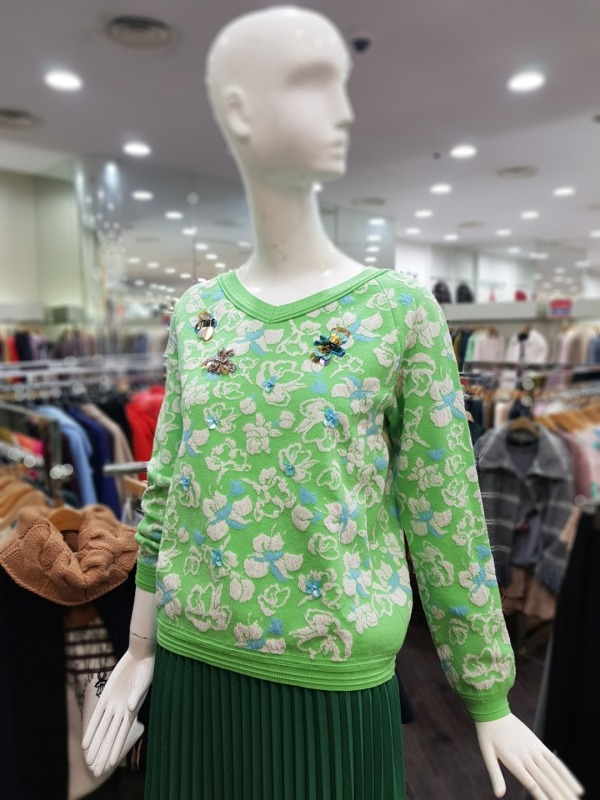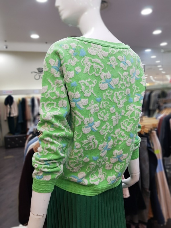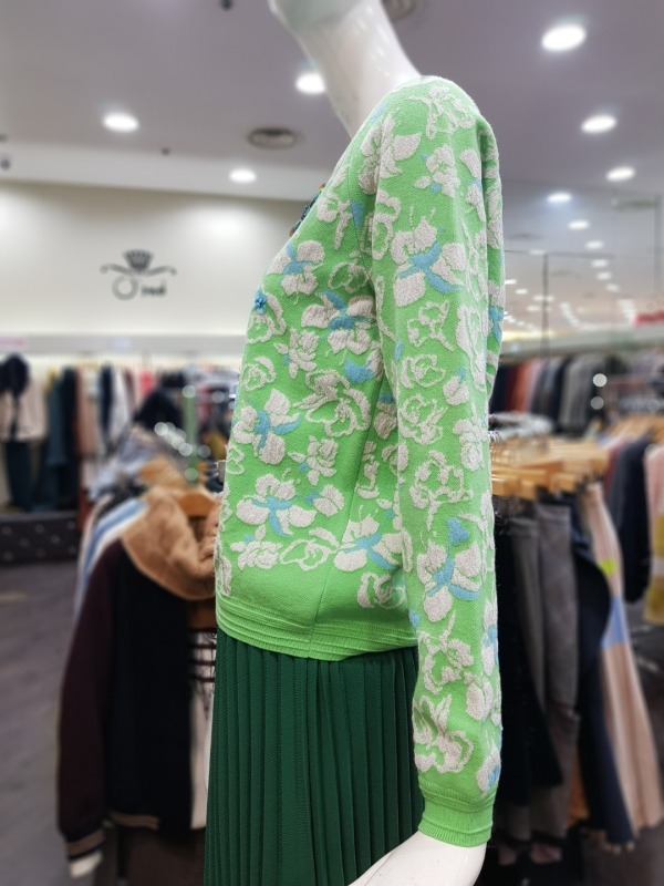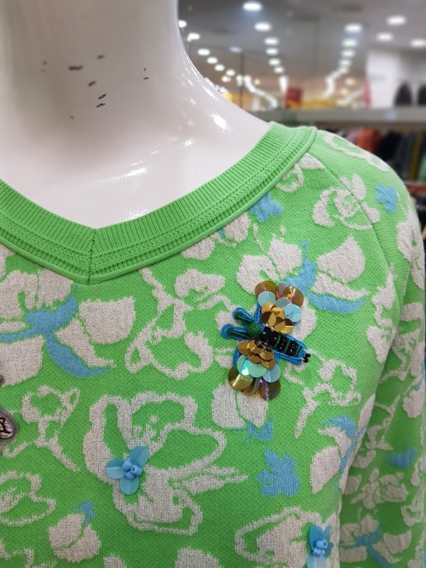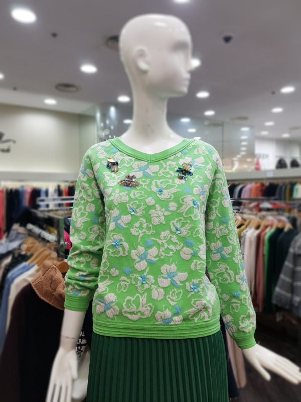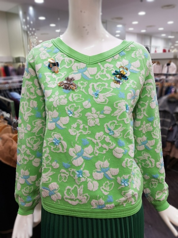 전면의 세련된 플로럴 패턴이 돋보이는 브이넥 니트로 정면의 곤충 비즈 디테일이 포인트인 제품입니다.
