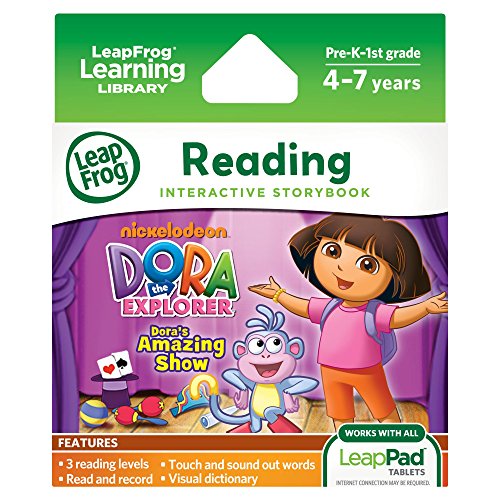 Light up the stage in Dora’s Amazing Show! Choose different acts to practice—from painting to pirate play and juggling to gymnastics—and see how it changes the final performance. Play music for Dora’s dance routine and dress her up in different costumes! Children ages 4-7 years will love learning about listening and reading comprehension, vocabulary, phonics and word recognition. This cartridge is compatible with LeapPad1 and LeapPad2 learning devices.