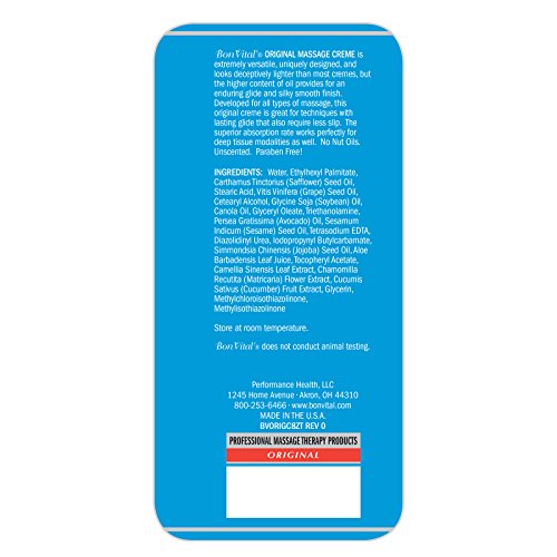 Studio : TheraBand Publisher : TheraBand Binding : Misc. Product Description Bon Vital is the #1 preferred brand of massage therapists focused on professional quality products. Its original family of cremes, oils, gels, and lotions provides the perfect foundation for relaxing massages of all modalities and techniques that heals dry skin and locks in moisture. The Original line of water dispersible formulas is ideal for blending with essential oils to create the ultimate aromatherapy massage experience. 0