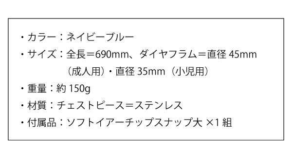 ●サイズ:全長=690mm、ダイヤフラム=直径45mm(成人用)・直径35mm(小児用)